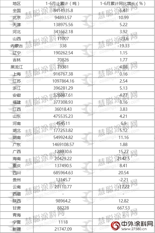 值得一提的是,增幅最大的地區(qū)是西北地區(qū)和中南地區(qū),此與甘肅與海南的增幅相對較大有關(guān)。根據(jù)數(shù)據(jù),2016年1-6月,海南省涂料產(chǎn)量達(dá)到2.04萬噸,增長幅度為2142.50%;甘肅省涂料產(chǎn)量為8.82萬噸,增長幅度為667.53%。