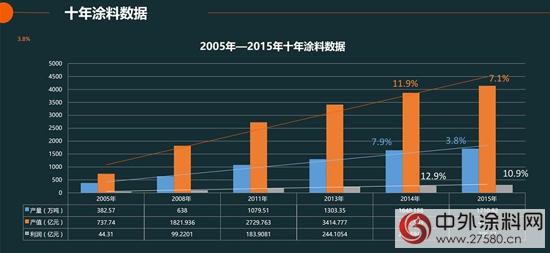 隨著過去十幾年中國城市化進(jìn)程的飛速發(fā)展,中國涂料工業(yè)的高速發(fā)展,總體受益于房地產(chǎn)、家具等行業(yè)的快速發(fā)展。過去十年,中國涂料行業(yè)快速發(fā)展,實現(xiàn)了11.16%的年復(fù)合增長率。但是,隨著中國經(jīng)濟(jì)逐步放緩,過去十幾年拉動涂料行業(yè)發(fā)展的主要動力——房地產(chǎn)、家具行業(yè)的忽冷忽熱,止步不前,中國涂料行業(yè)亦面臨增速放緩難題,中國涂料工業(yè)如何穩(wěn)步發(fā)展,亦是思考。