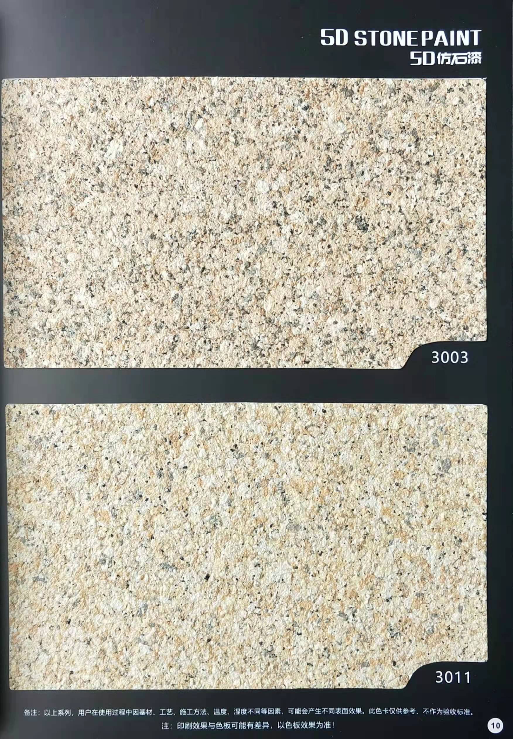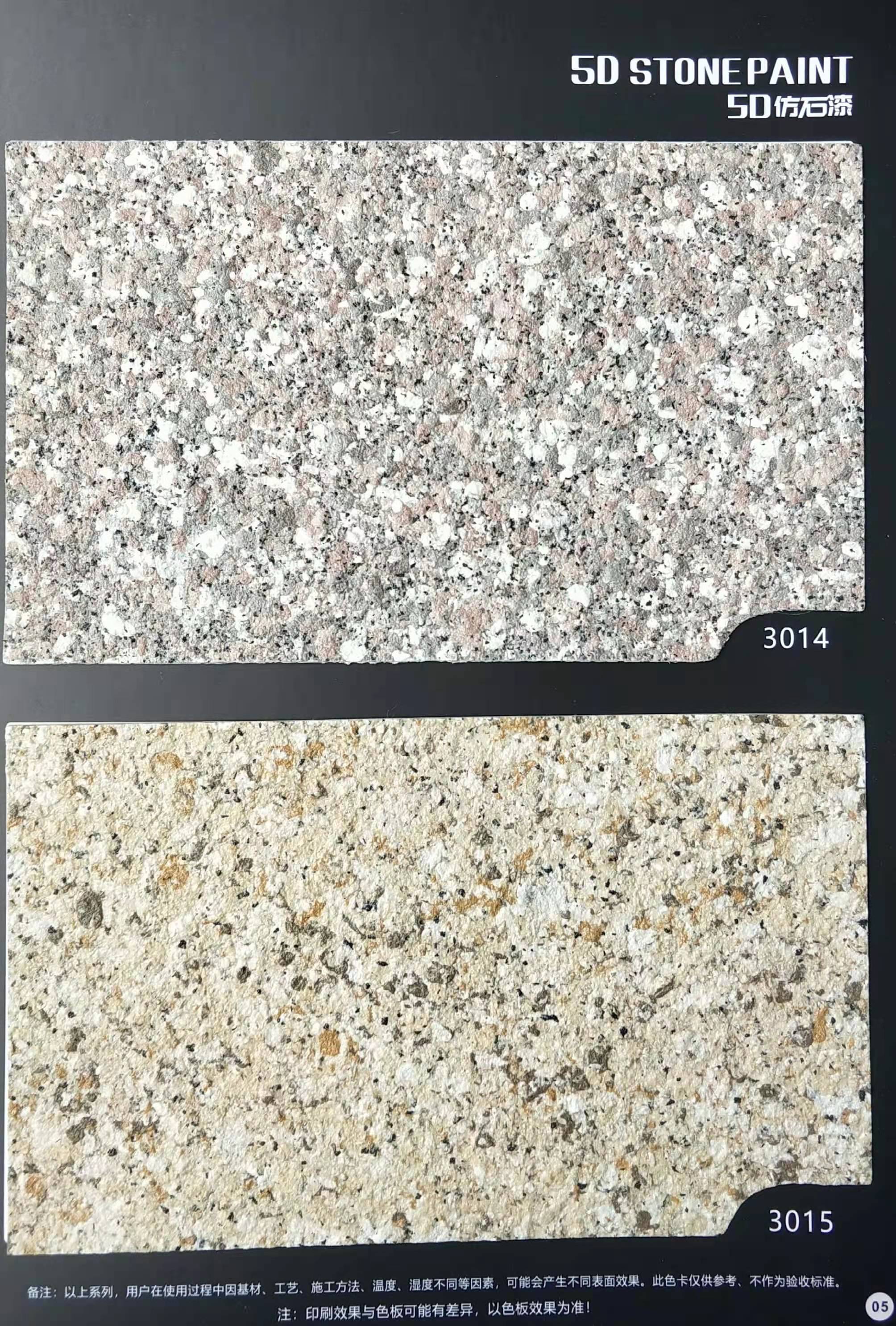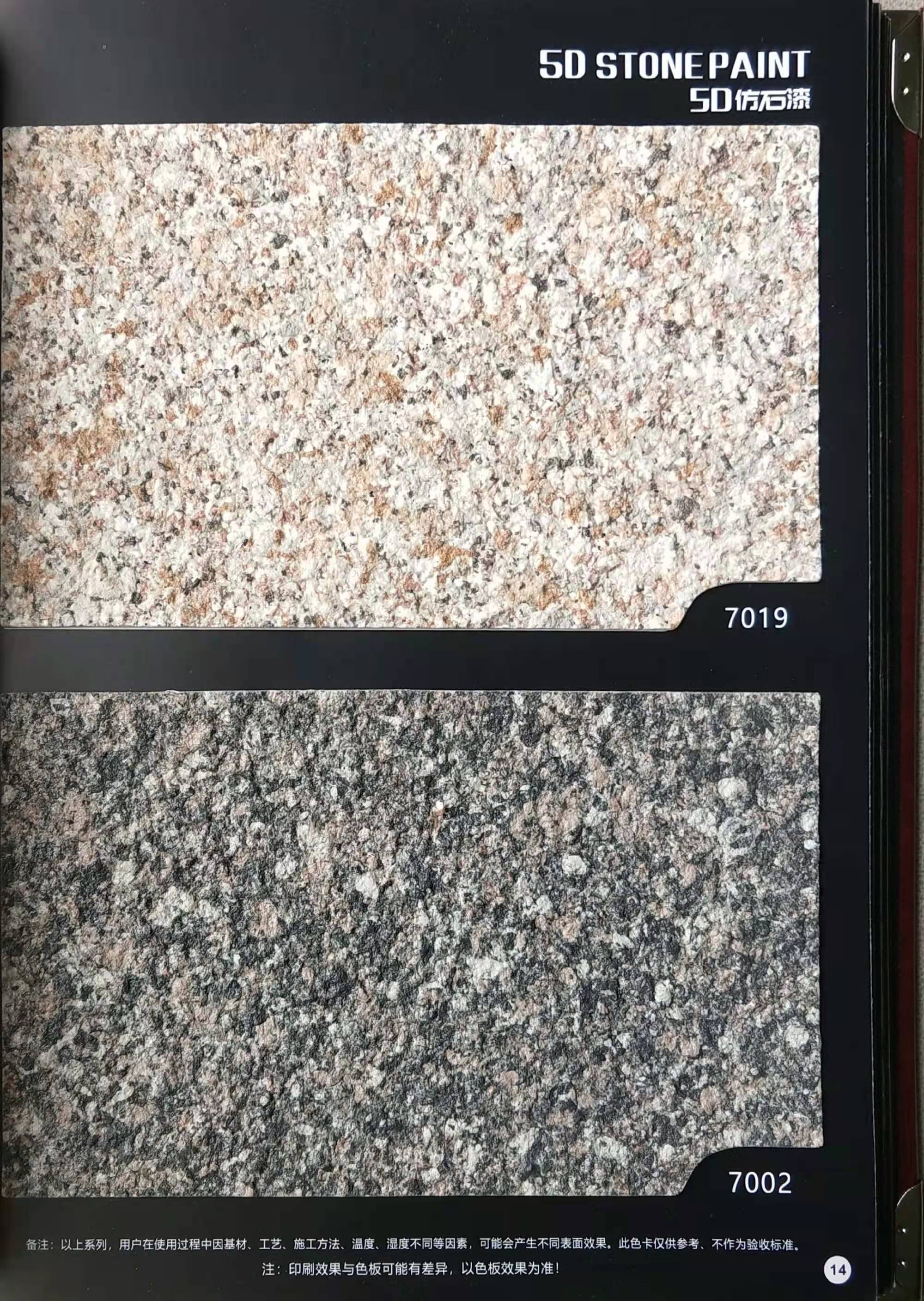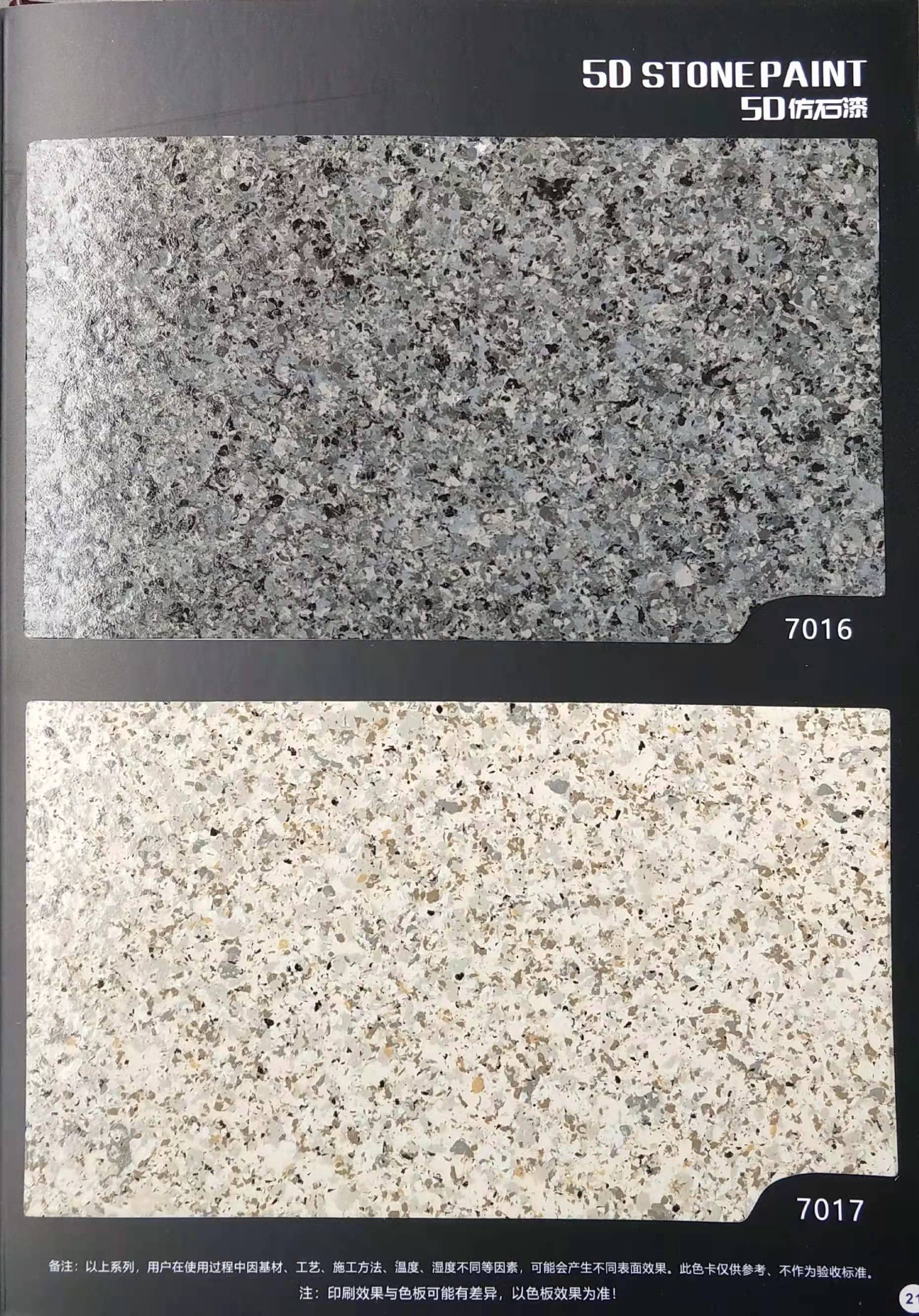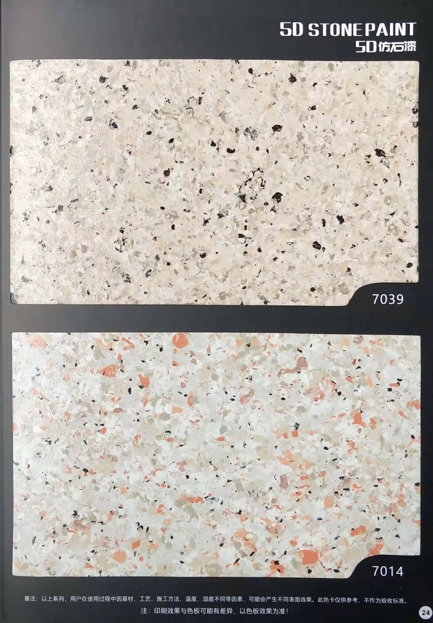 為方便市場客戶對(duì)5D仿石漆樣式的選擇,滿足消費(fèi)者對(duì)其產(chǎn)品效果的體現(xiàn),友情漆現(xiàn)在推出一套全方景立體式展現(xiàn),用不同色彩仿石漆組合裝飾出來的墻面效果圖冊(cè)。