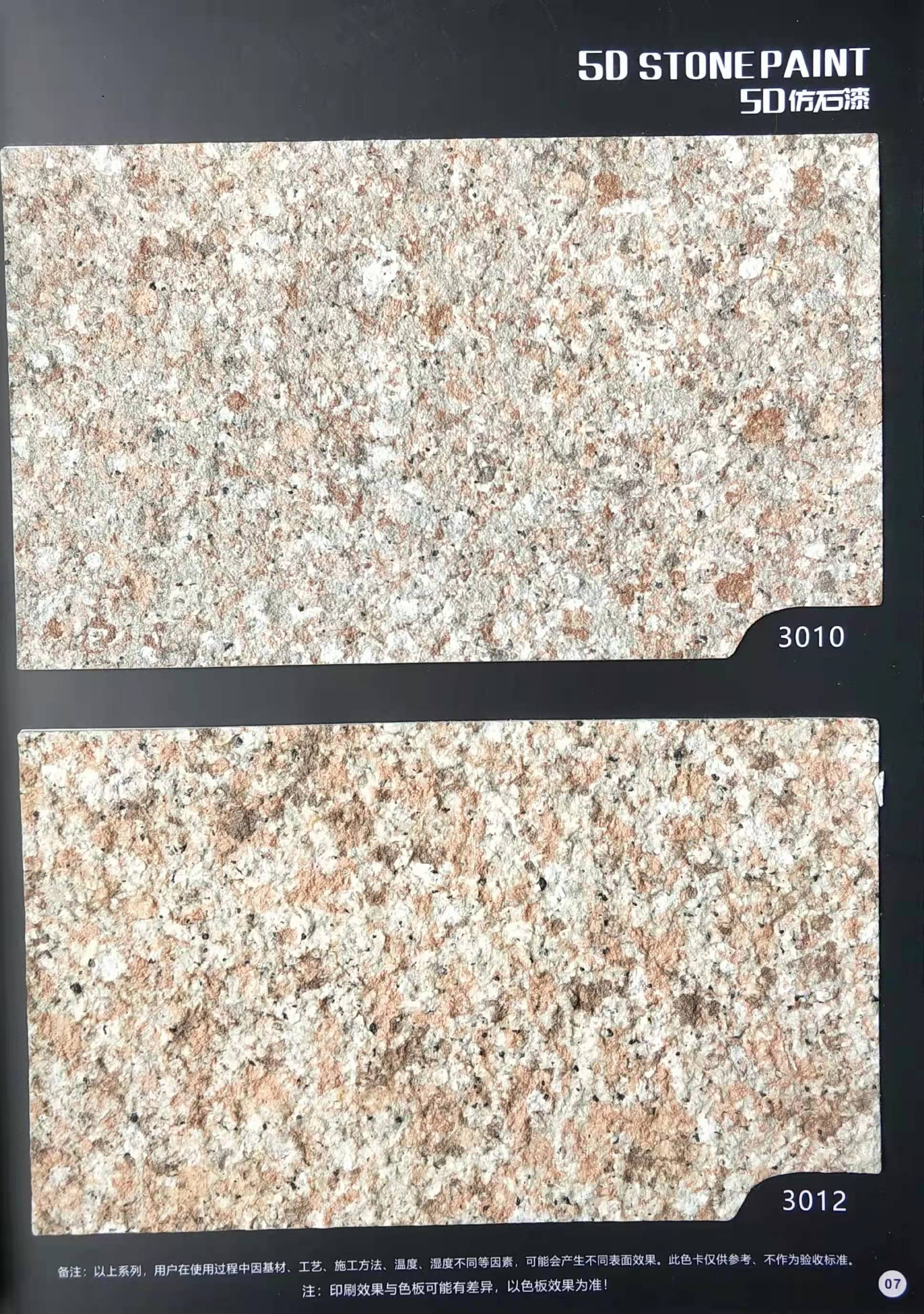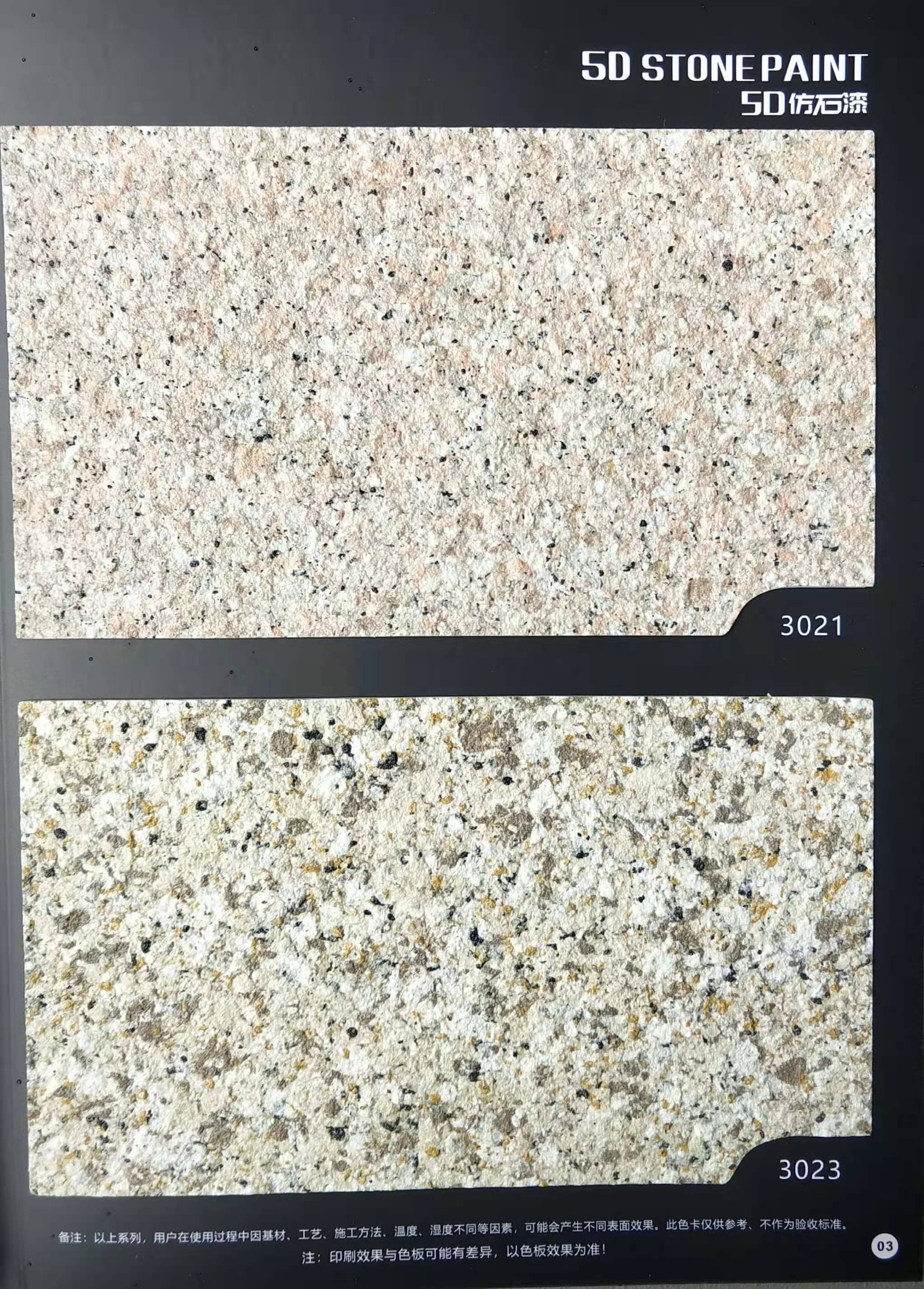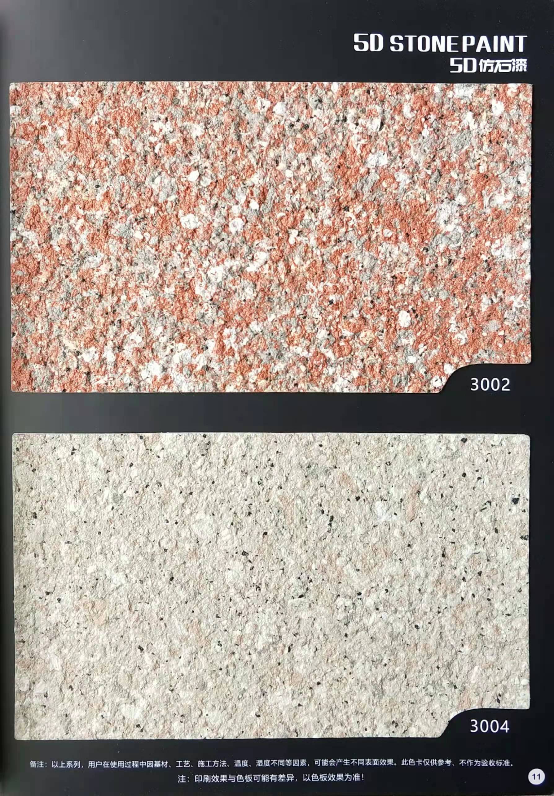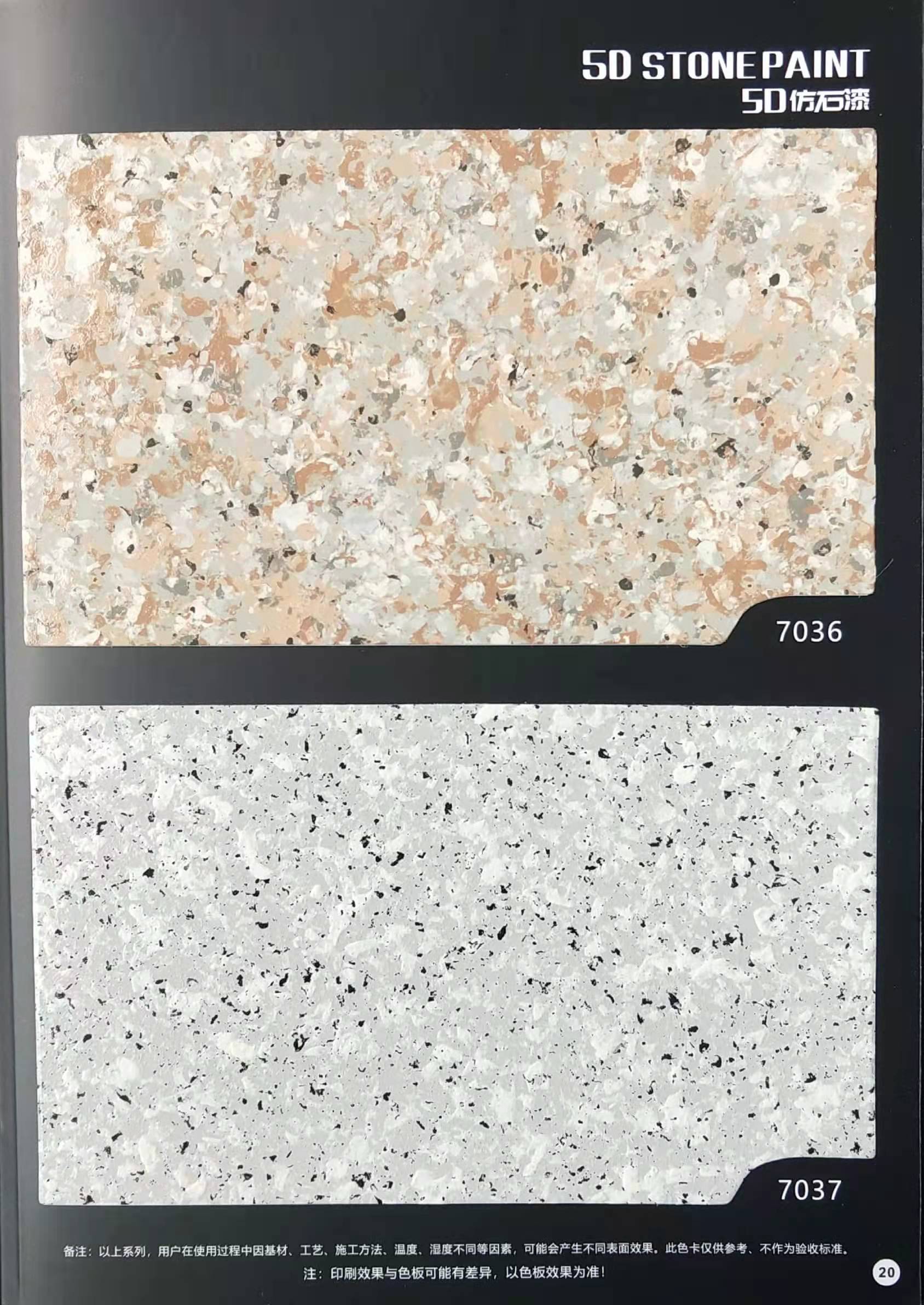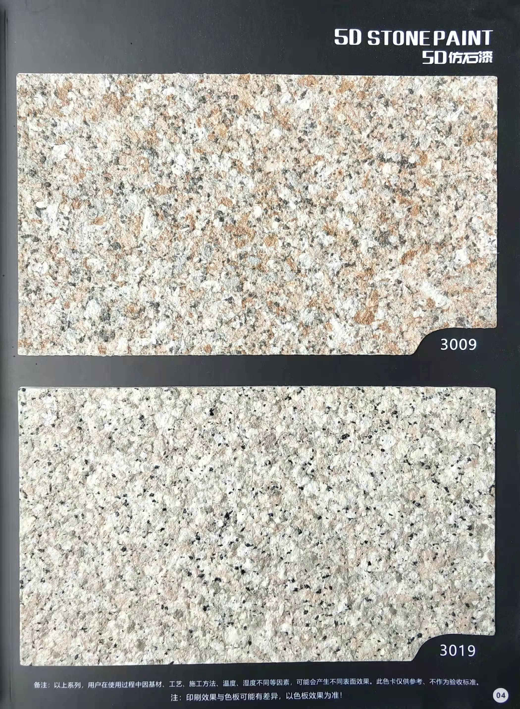 為方便市場客戶對(duì)5D仿石漆樣式的選擇,滿足消費(fèi)者對(duì)其產(chǎn)品效果的體現(xiàn),友情漆現(xiàn)在推出一套全方景立體式展現(xiàn),用不同色彩仿石漆組合裝飾出來的墻面效果圖冊(cè)。