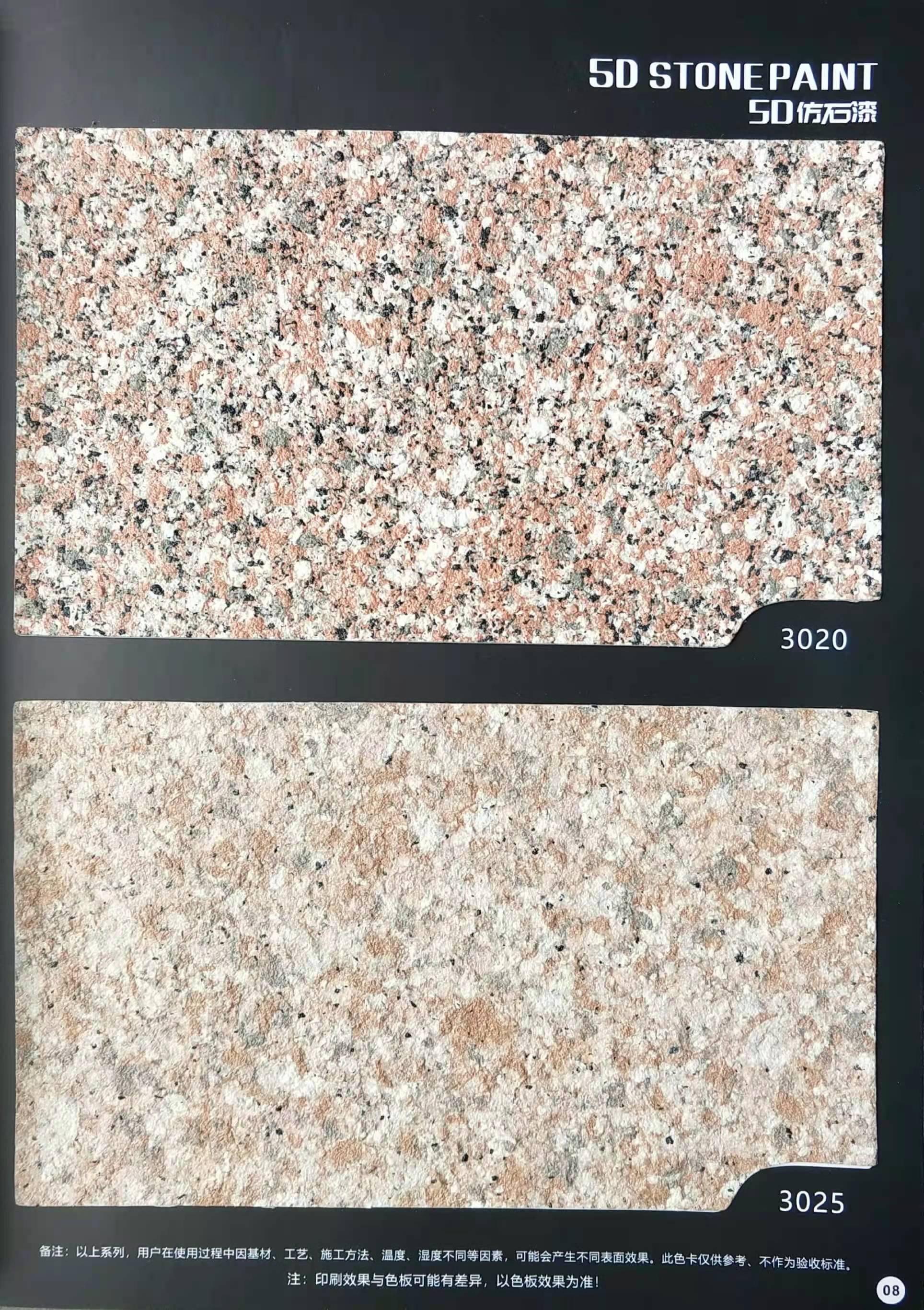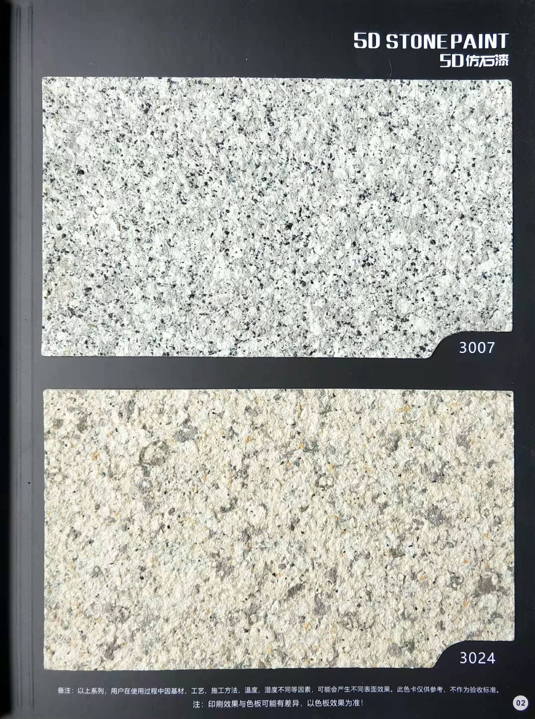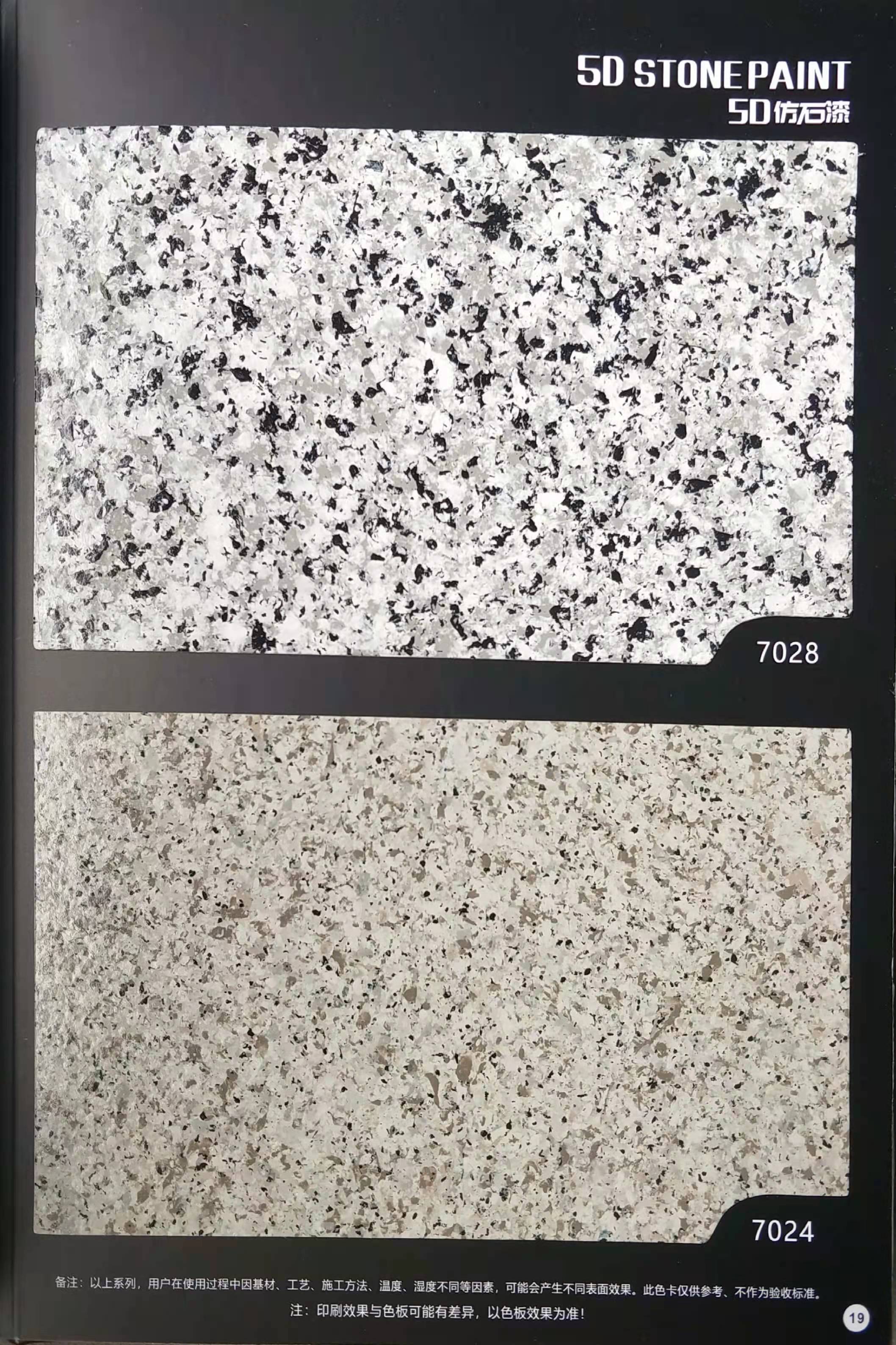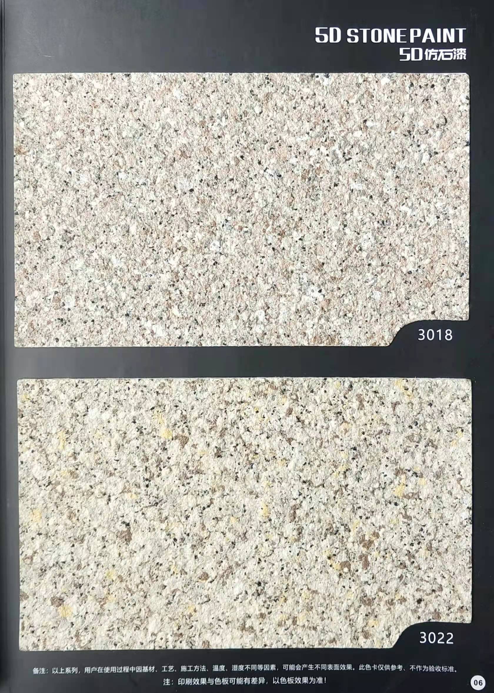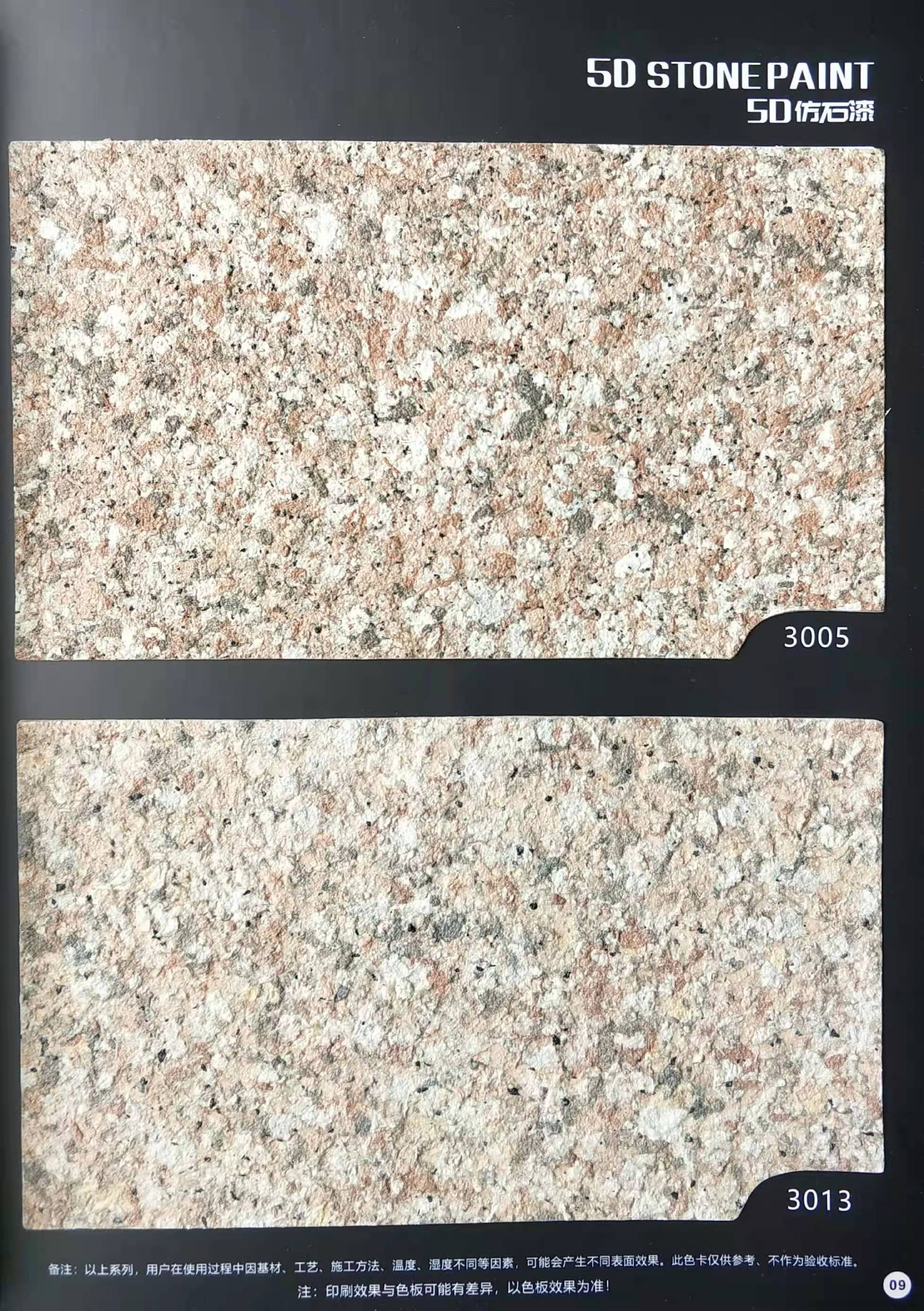 為方便市場客戶對(duì)5D仿石漆樣式的選擇,滿足消費(fèi)者對(duì)其產(chǎn)品效果的體現(xiàn),友情漆現(xiàn)在推出一套全方景立體式展現(xiàn),用不同色彩仿石漆組合裝飾出來的墻面效果圖冊(cè)。