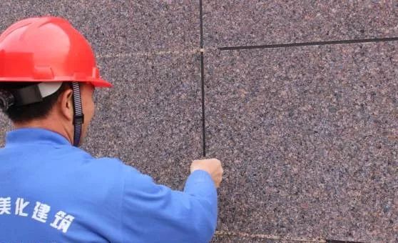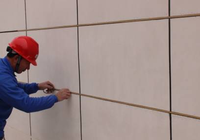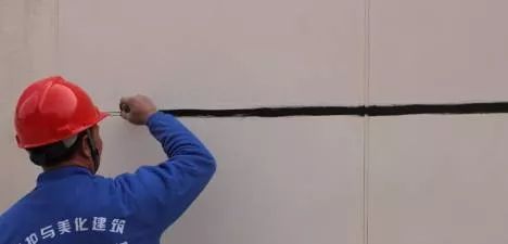 膩子施工完,涂刷抗堿封閉底漆后,可進行分格縫工序。根據(jù)設(shè)計的分格大小,用彈線的方式在墻面上畫分格。