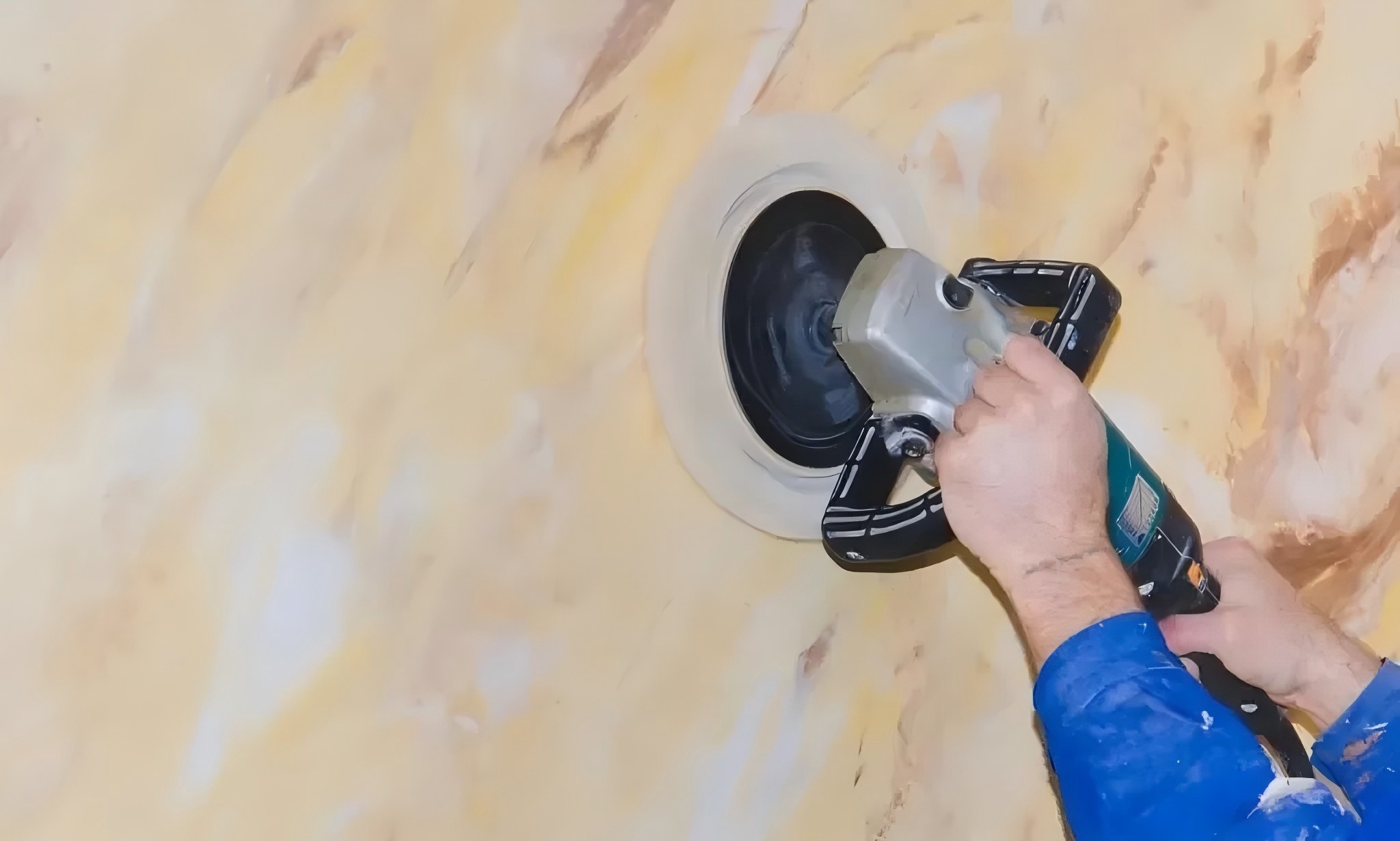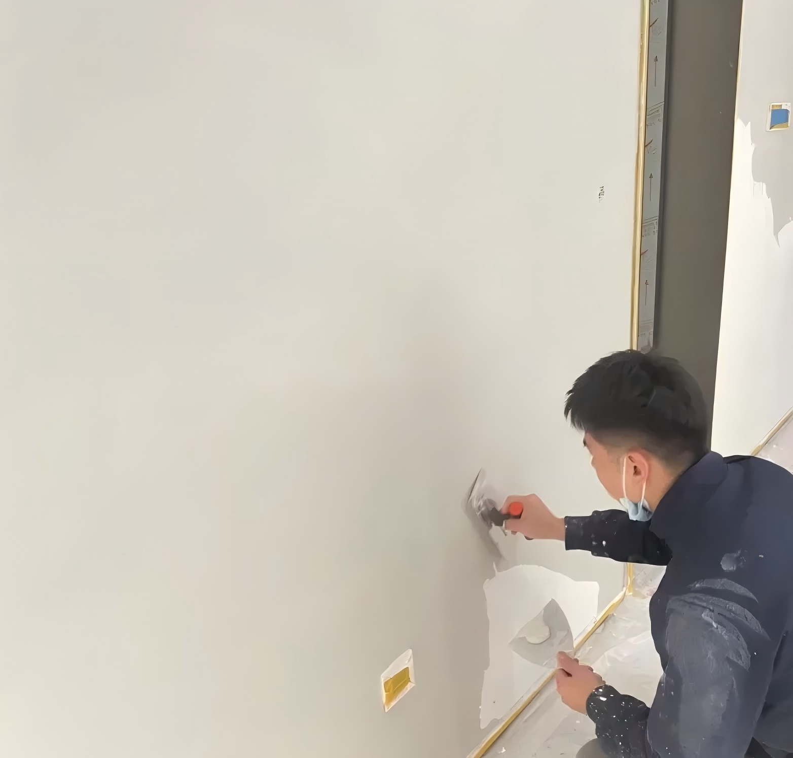 4. 最后一道工序就是拋光,這時需要我們用專業的不銹鋼刀進行角度調整,批刮打磨,最終完成的效果就可以實現和大理石一樣的光澤,非常具有實質感,至此藝術漆才算完成!