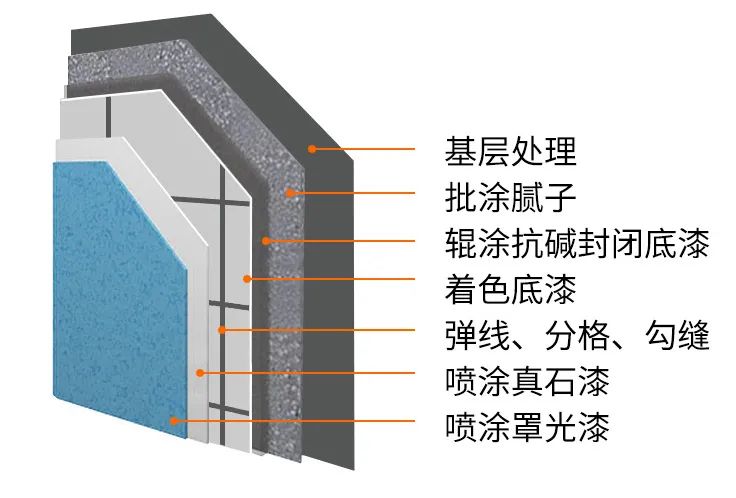 真石漆涂料的組成:真石漆涂料由底漆層,真石漆層和罩面漆層組成。底漆層必須是具有抗堿密封作用的底漆,以隔離和防止水分從基礎(chǔ)混凝土滲透到涂層中,增強(qiáng)涂層與基礎(chǔ)表面之間的附著力,可防止涂層剝落。真石漆層在飾面上形成各種圖案,是呈現(xiàn)出立體感的主體材料。罩面層是飾面的保護(hù)層,不僅增強(qiáng)了真石漆層的防水功能,而且提高了涂層的耐候性和抗污染性,提高了涂膜的硬度,并使涂膜表面更有光澤且易于清潔。
